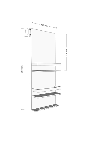 Overall dimensions are approximately 780mm high by 300mm wide with 100mm deep shelf.